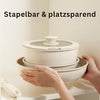Super stapelbar und damit enorm platzsparend, abnehmbare Griffe sehr handlich, leicht sauber zu bekommen, da auch die Beschichtung hält, was sie verspricht! Preis-Leistungsverhältnis absolut top!